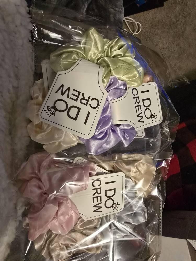My high-quality Silk Satin Scrunchies are the perfect gift for Bridesmaids, Weddings, Bachelorette Parties, and Flower Girls. These luxurious silk scrunchies add a stylish touch to any bridesmaid proposal box and come with a glossy card that reads: "I DO CREW"